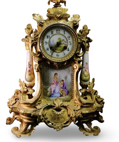 Ceas din bronz dore, portelan pictat manual cu personaje si decoratiuni florale
