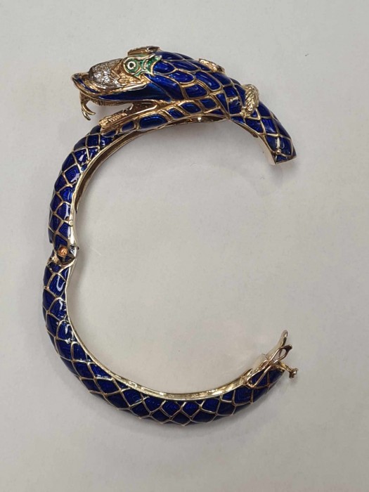 Bratara realizata din aur galben de 14k, cu email si 20 buc diamante naturale, taietura: rotund briliant, aprox. 0.38 ct. si 2 buc smaralde narurale rotunde fatetate, culoare: verde, claritate heavily included, aprox. 0.016 ct, diametru interior: 5.5 cm, greutate: 83.19 grame.