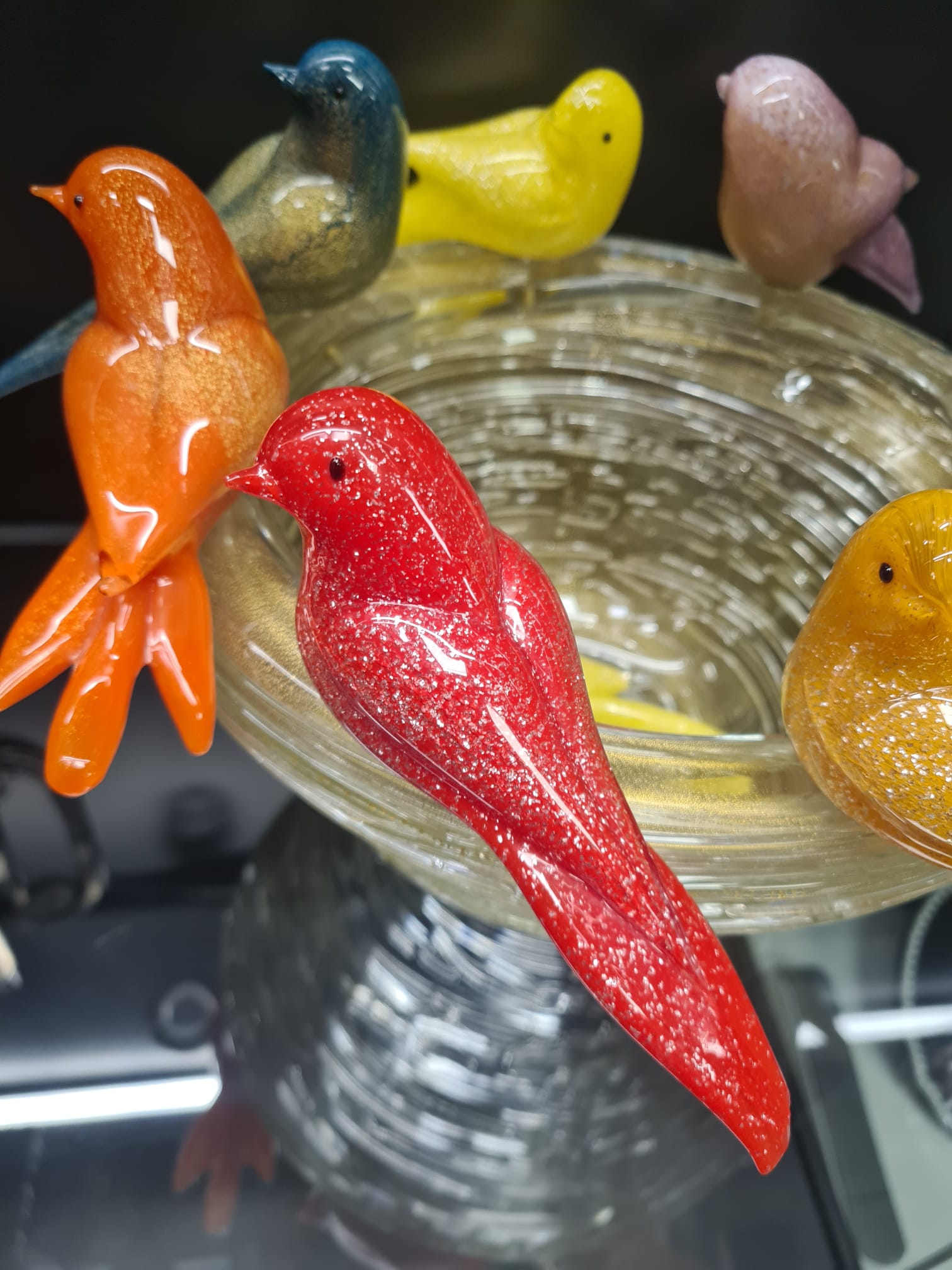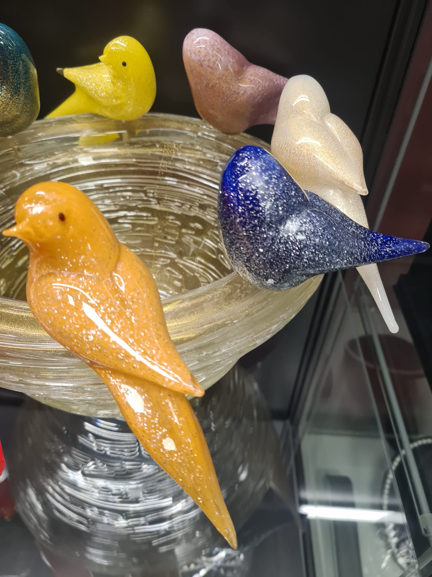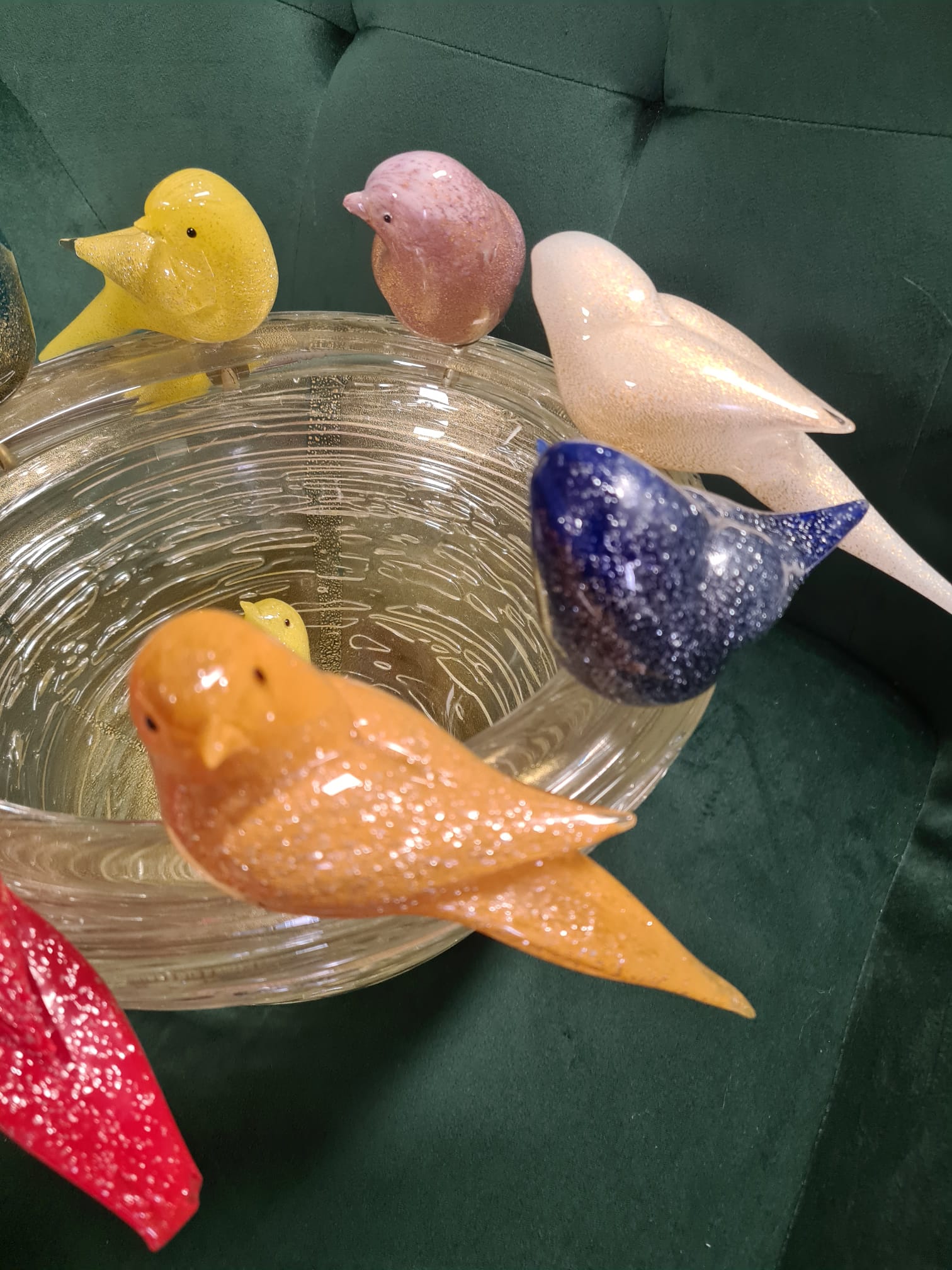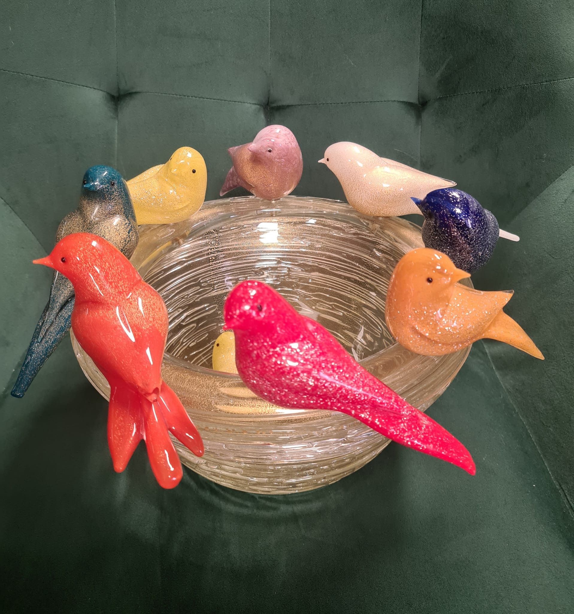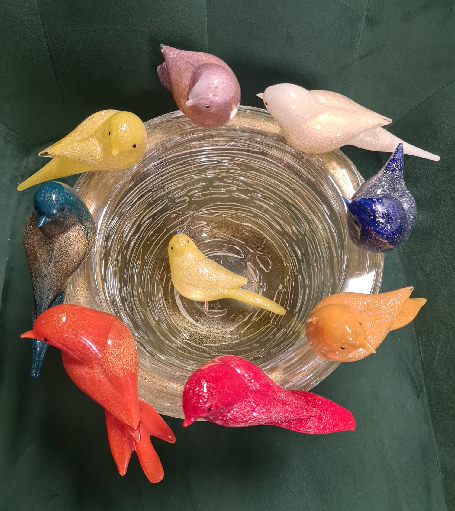 Fructiera cu 8 figurine decorative din sticlă de Murano, realizate manual în Italia, semnata Paolo Rubelli, reprezentând păsări colorate așezate pe un cuib de sticlă.