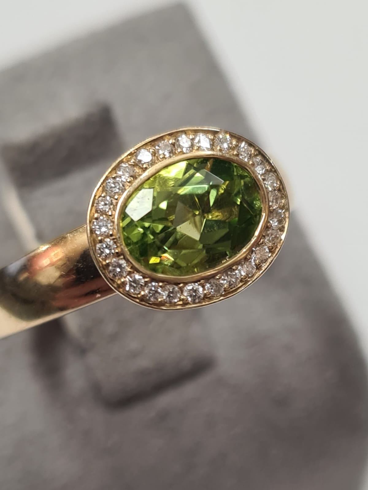 Inel realizat din aur galben de 14k, decocat cu 1 bucata peridot natural, si 26 bucati diamante naturale, aprox. 0.13 ct, taietura: rotund briliant , marime: 56, greutate: 5.56 grame.