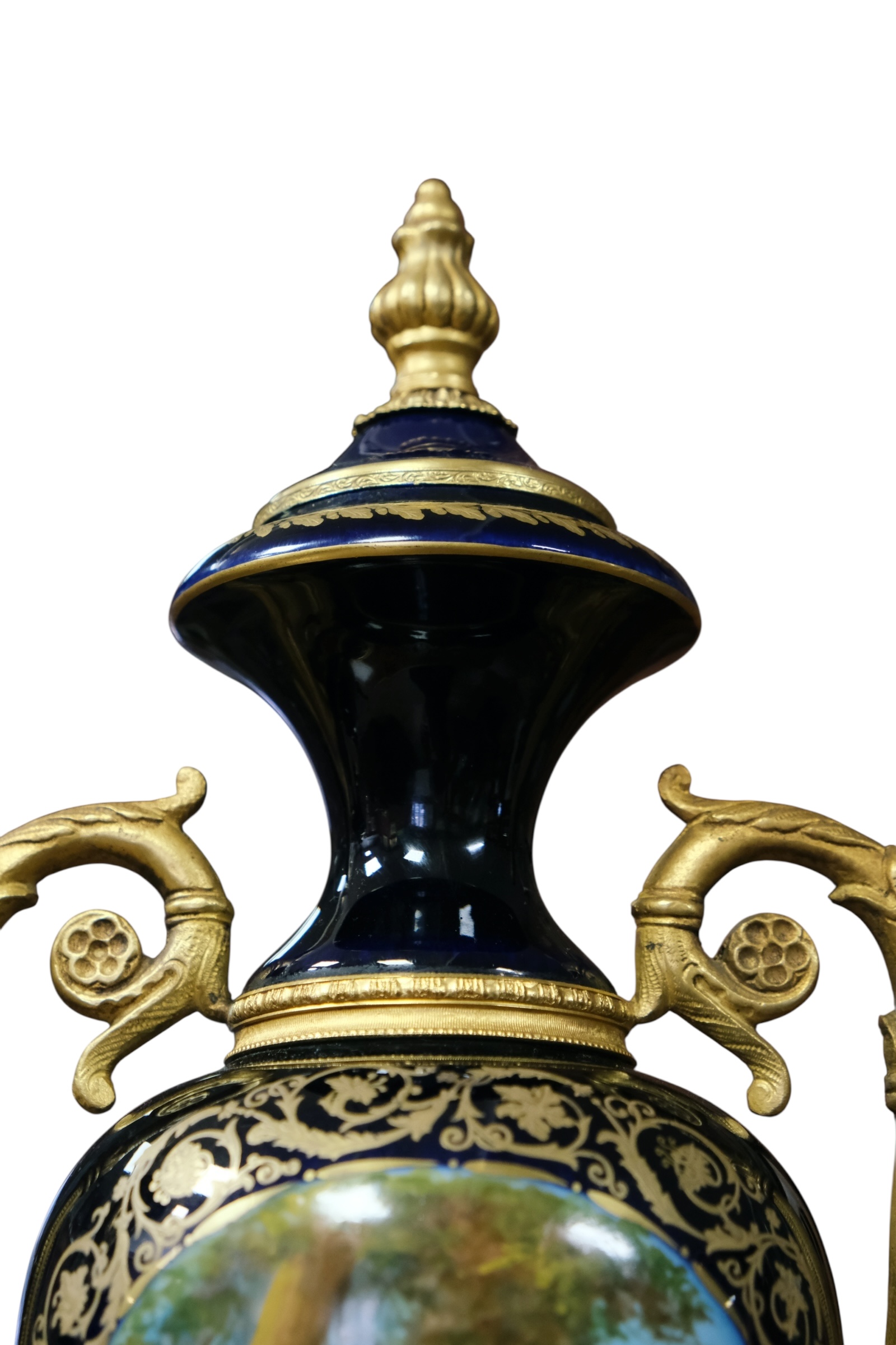 Pereche de amfore franțuzești în stil Sèvres din porțelan și monturi din bronz dore.