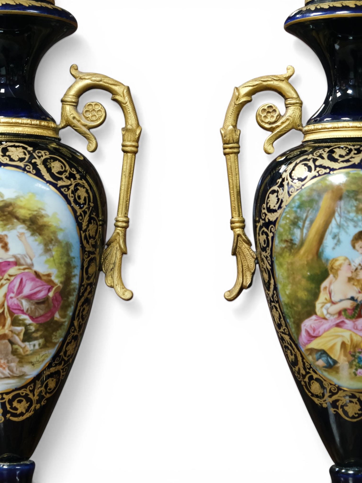 Pereche de amfore franțuzești în stil Sèvres, realizate din porțelan și monturi din bronz dore.