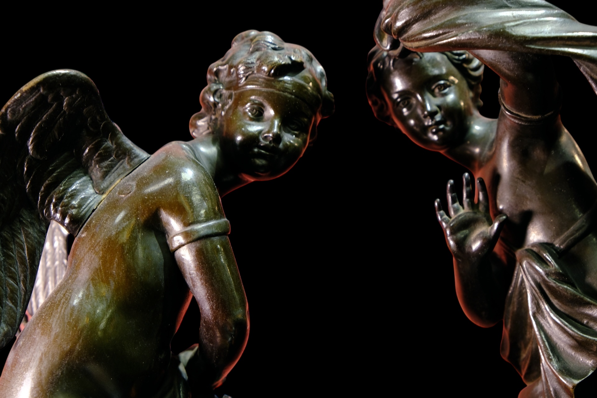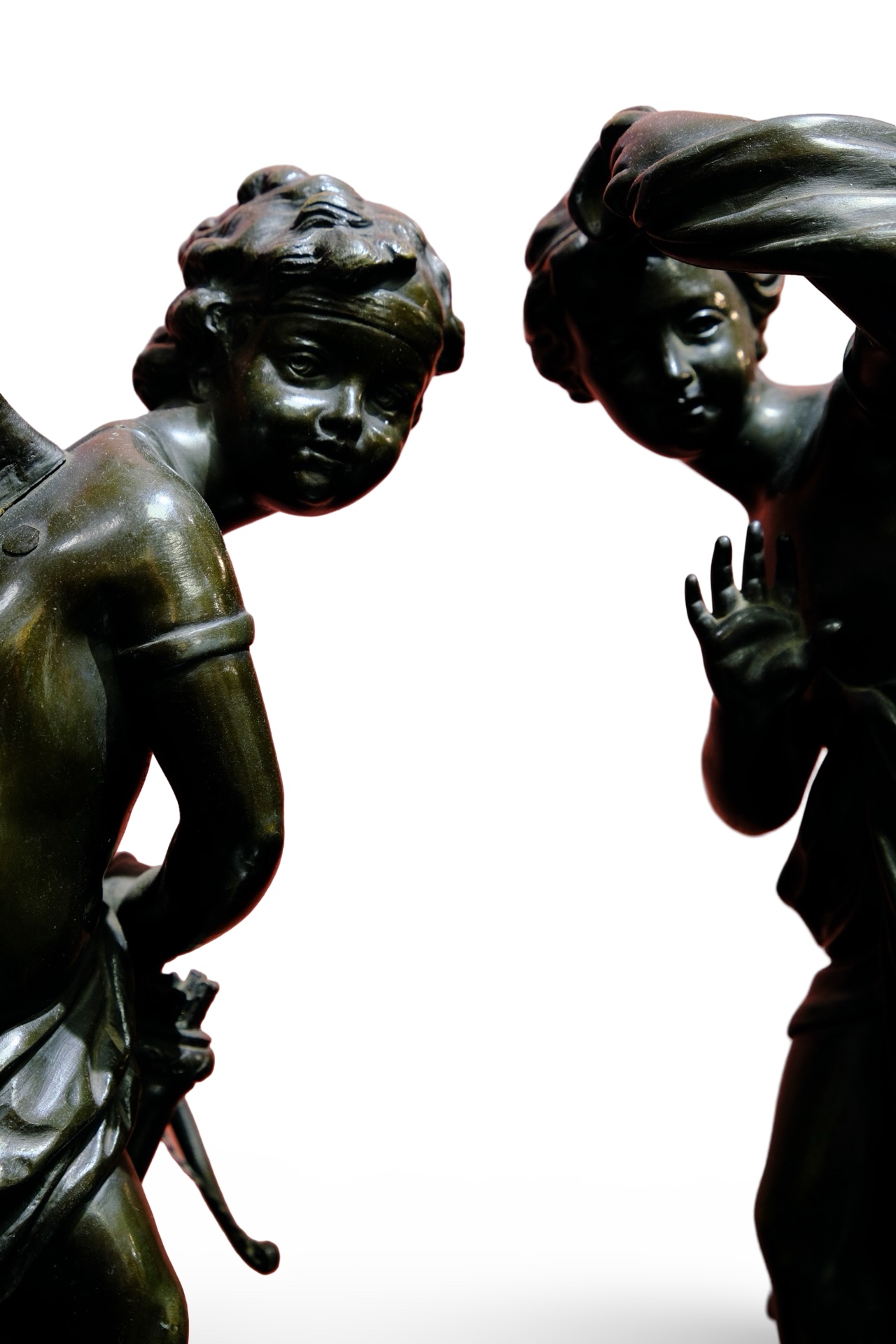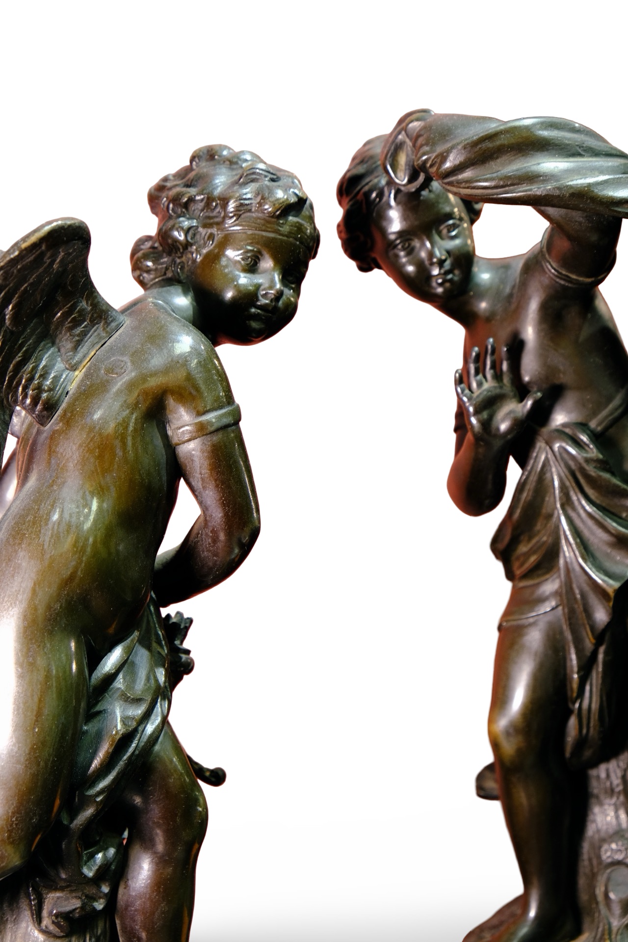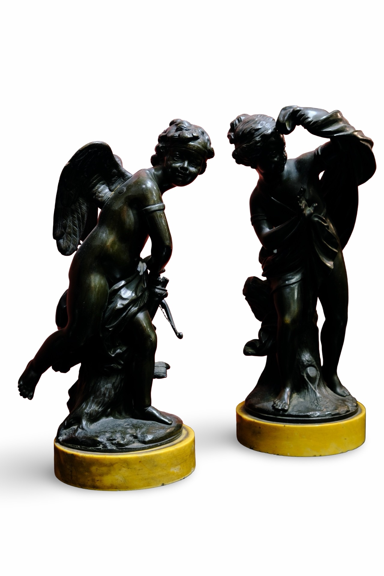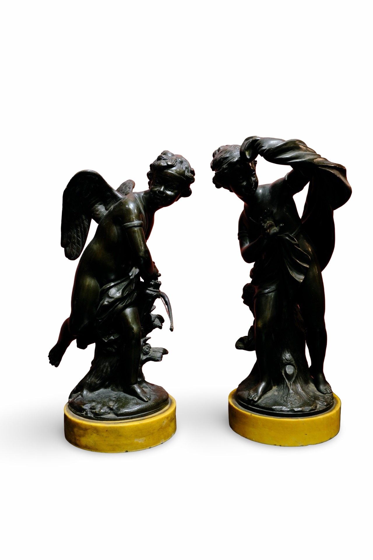 Pereche de sculputuri din bronz patinat pe soclu din marmura, amorasi, Sevres