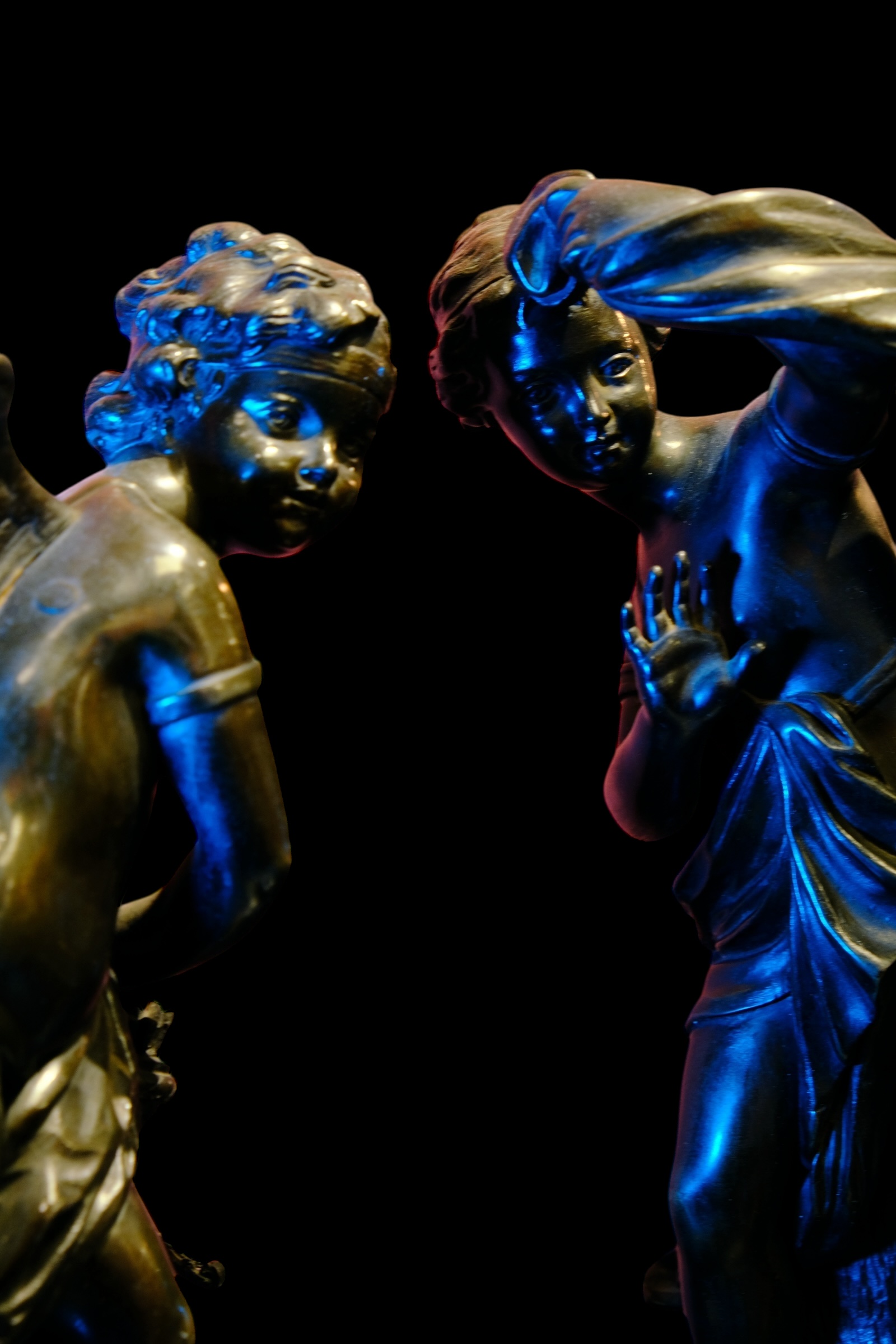 Pereche de sculputuri din bronz patinat pe soclu din marmura, amorasi, semnate: Sevres, tara de provenianta Franta sec. XIX, acestea sunt reprezentari ale unor heruvimi inaripati, imbracati in costume de epoca, sprijinindu-se de un trunchi de copac.