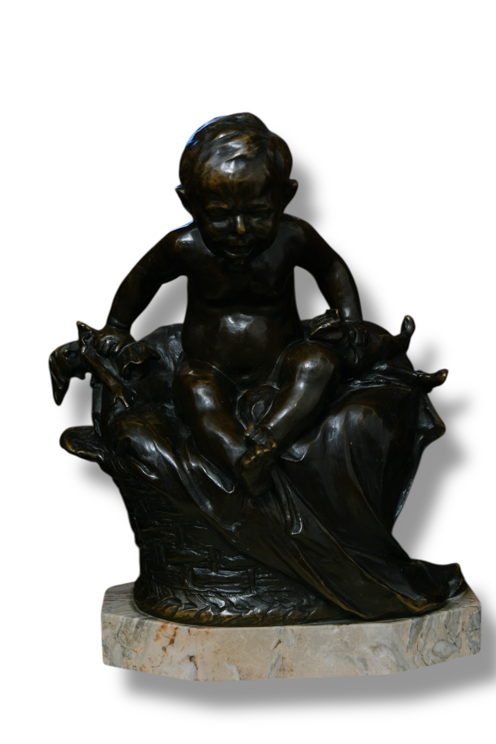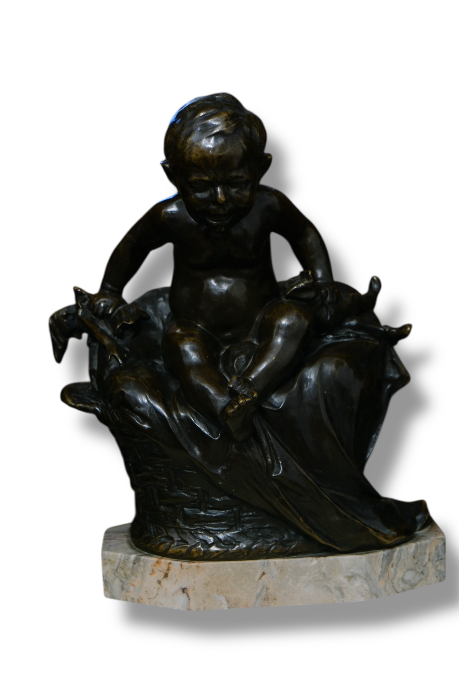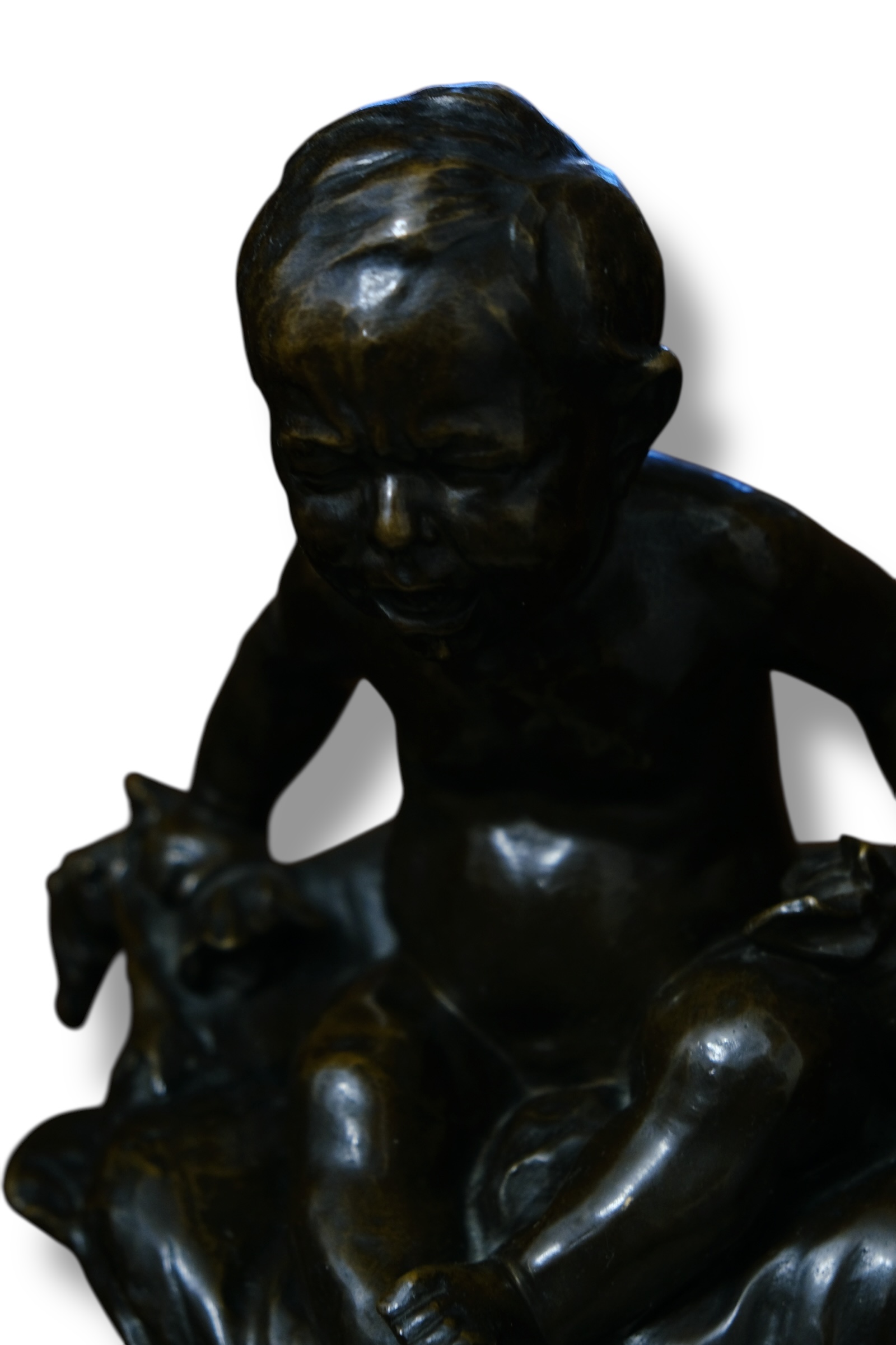 Copil cu arlechin din bronz patinat cu soclu din marmura, semnat Lichtenberg,dimensiune 35 x 27 cm.